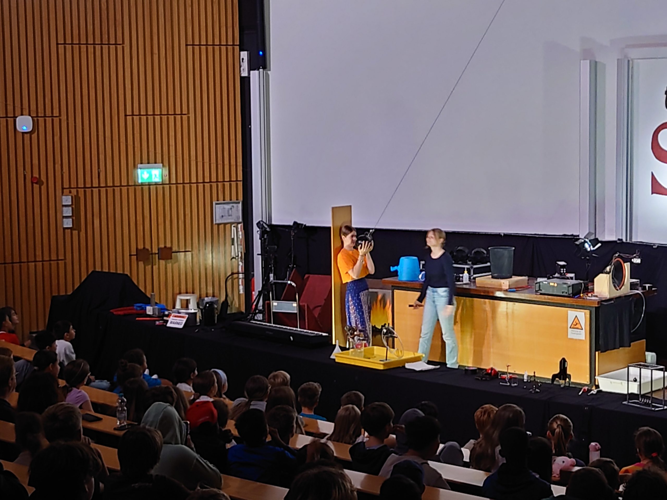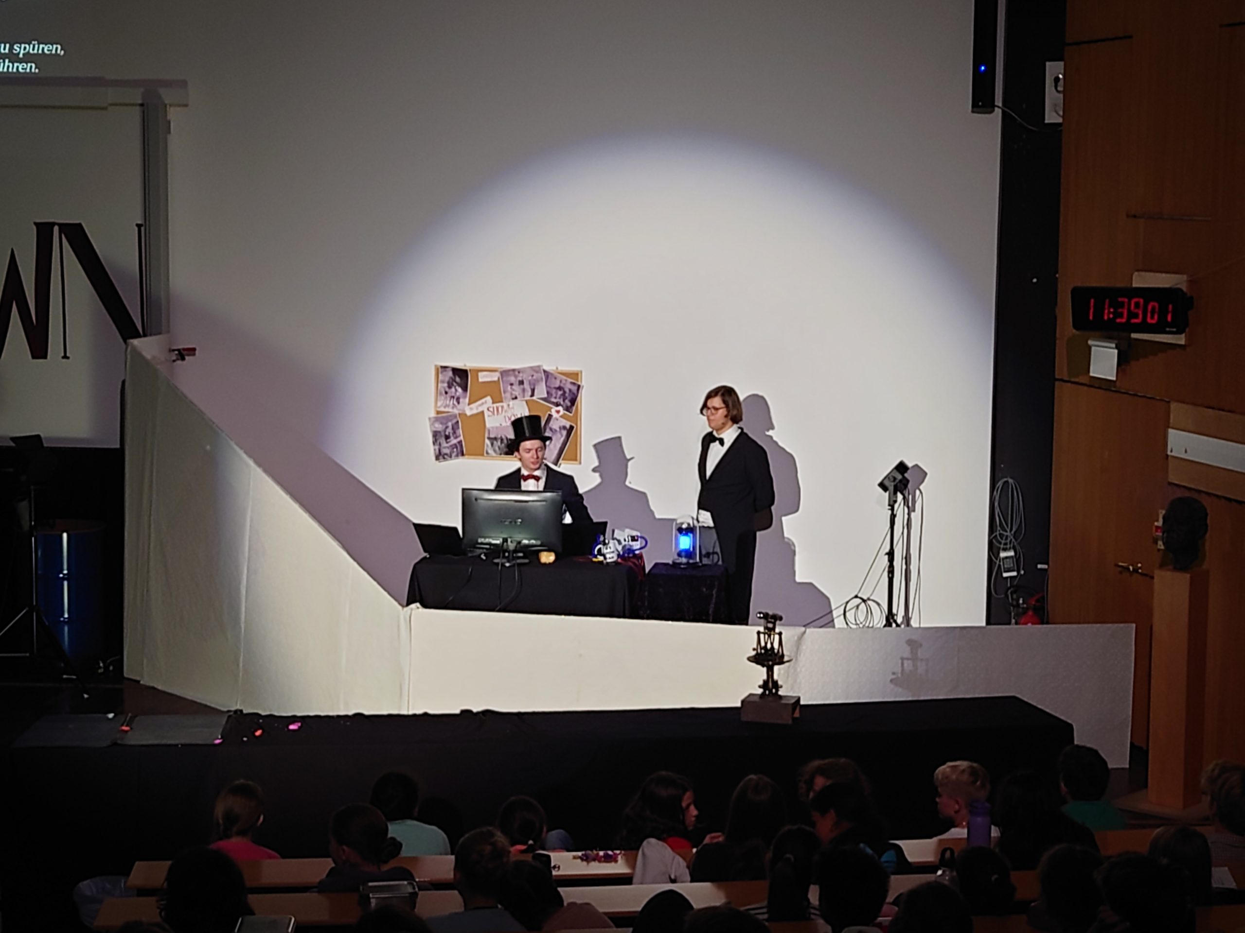 In der von Student(inn)en der Universität inszenierten Vorführung konnten die Zuschauer der Jahrgänge 5 bis 7 insgesamt 15 Experimente bestaunen, die im Rahmen einer Kriminalgeschichte demonstriert wurden.